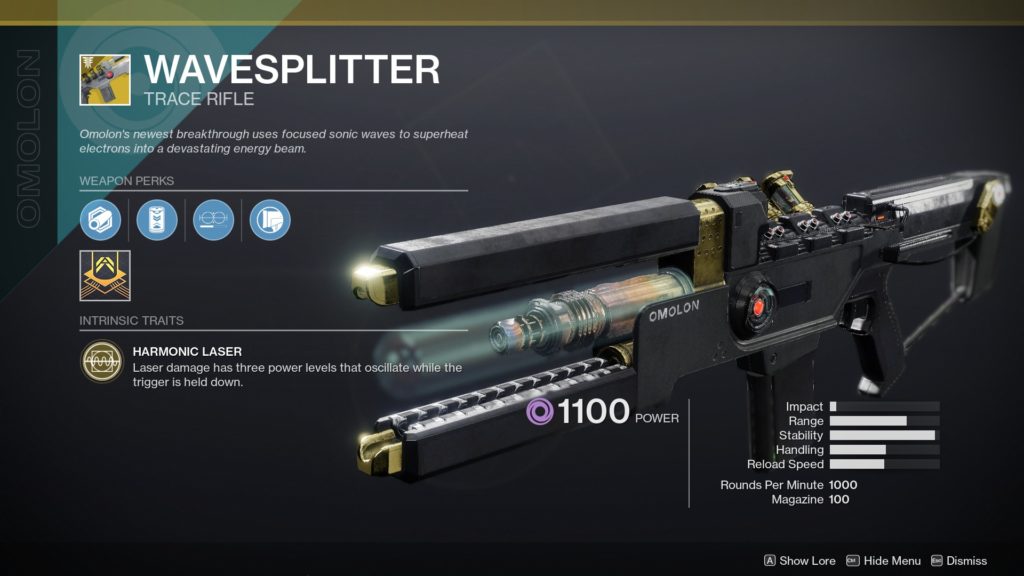 The Void-damage powered Wavesplitter trace rifle was introduced in the Forsaken expansion, originally as a PS4 exclusive. Wavesplitter was designed by the same group, Omolon, that created Coldheart, but instead of cold-fusion, it fires sonic waves.