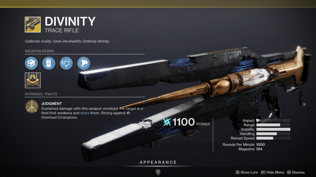 Divinity is available via an exotic quest in the Shadowkeep expansion, and requires completion of the Garden of Salvation raid plus some extra steps. It’s a weapon that is sacred to the Vex and very important to them. It deals Arc damage with a huge magazine size.
