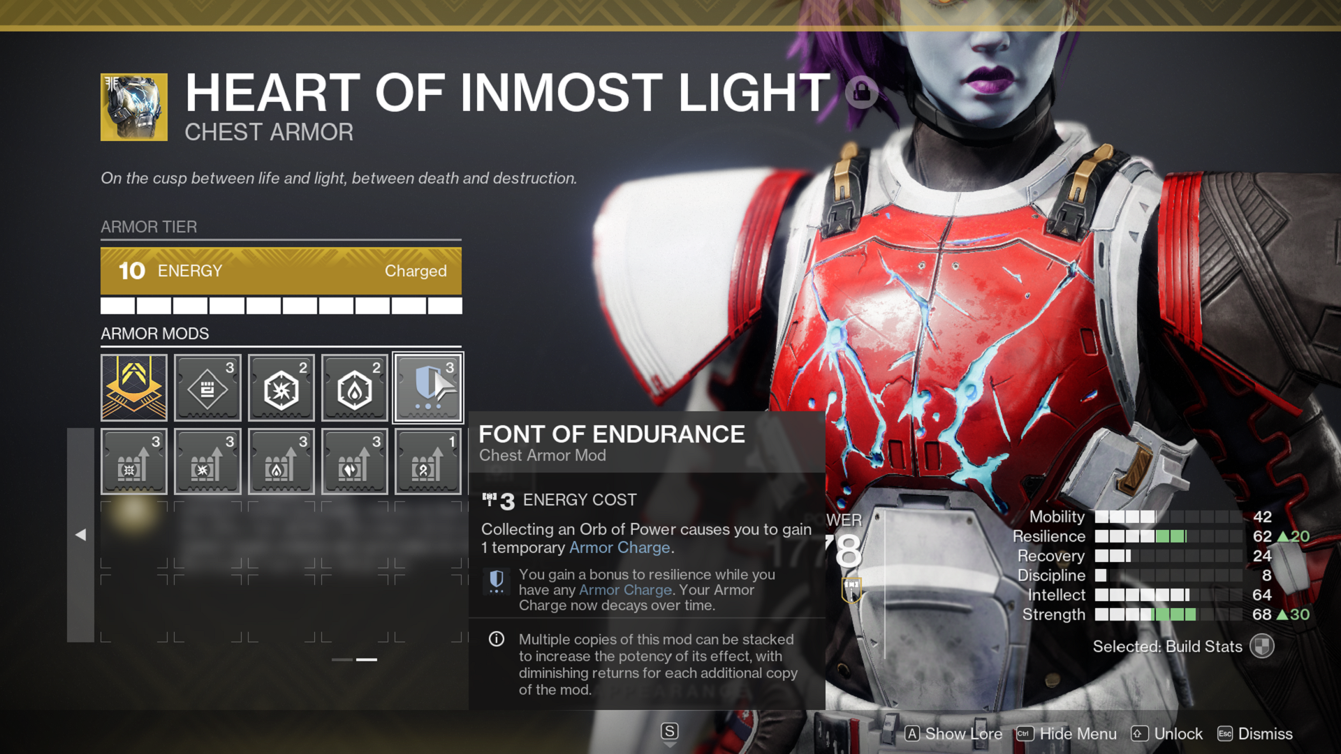 A quick example: this Titan chest armor piece has one Armor Charge mod. With the Font of Endurance mod, whenever they collect an Orb of Power, they get increased resilience. The heightened stat doesn’t stack with the amount of Orbs you collect, but due to the fact Armor Charge decays over time, that higher stat lasts longer.