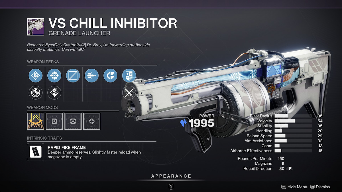 | VS Chill Inhibitor | Grenade launcher (heavy) | Stasis | Rapid-Fire Frame 150rpm |