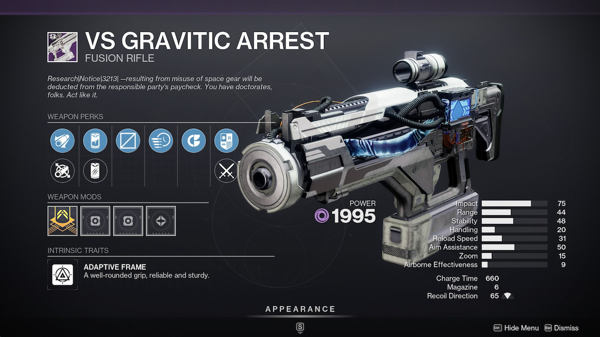 | VS Gravitic Arrest | Fusion rifle | Void | Adaptive Frame 660ms |