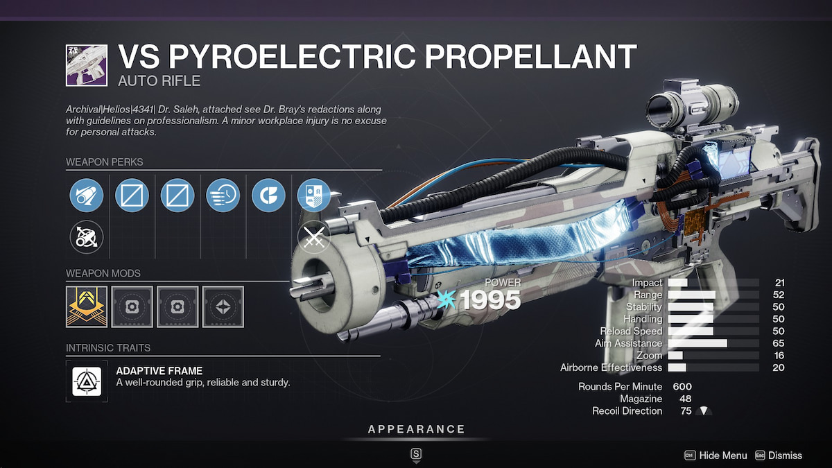 | VS Pyroelectric Propellant | Auto rifle | Arc | Adaptive Frame 600rpm |