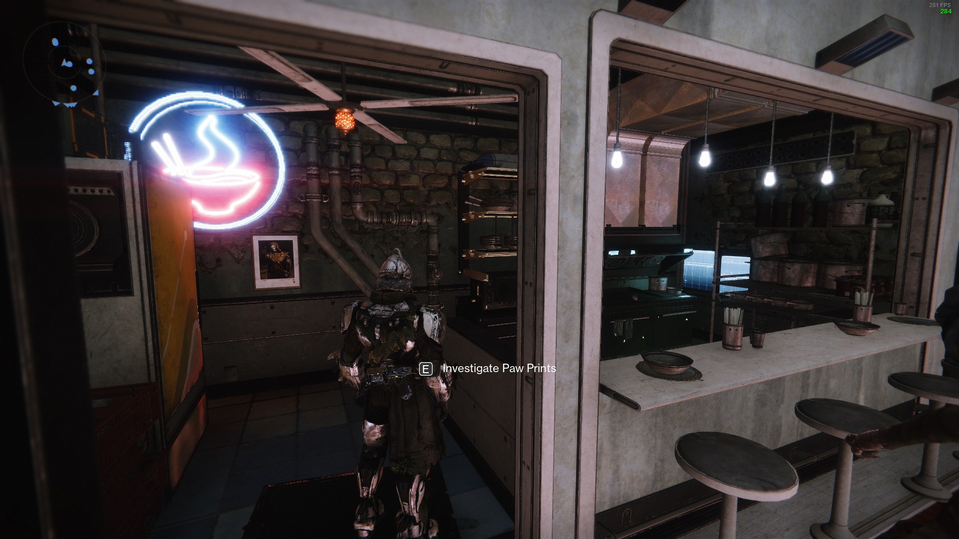 Head upstairs to the Tower’s bazaar and turn left. Close to the staircase is the small ramen shop with a photo of Cayde-6 on the wall. Behind the counter is another series of paw prints. It seems Archie had his fill and continued exploring. Inspect the prints and you’ll be given the next hint: “Archie wanted to go pay his respects to a famous gunslinger.”