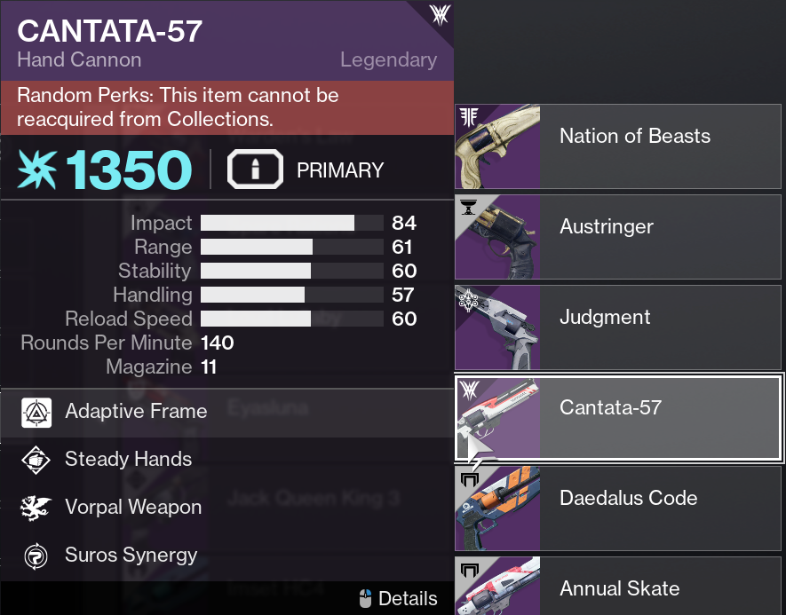 A Suros hand cannon, Cantata-57 comes with Suros Energy built in as its basic origin trait. This perk offers bonus weapon handling and reduced flinch for a short time after reloading, so it feels extra smooth in the right hands.