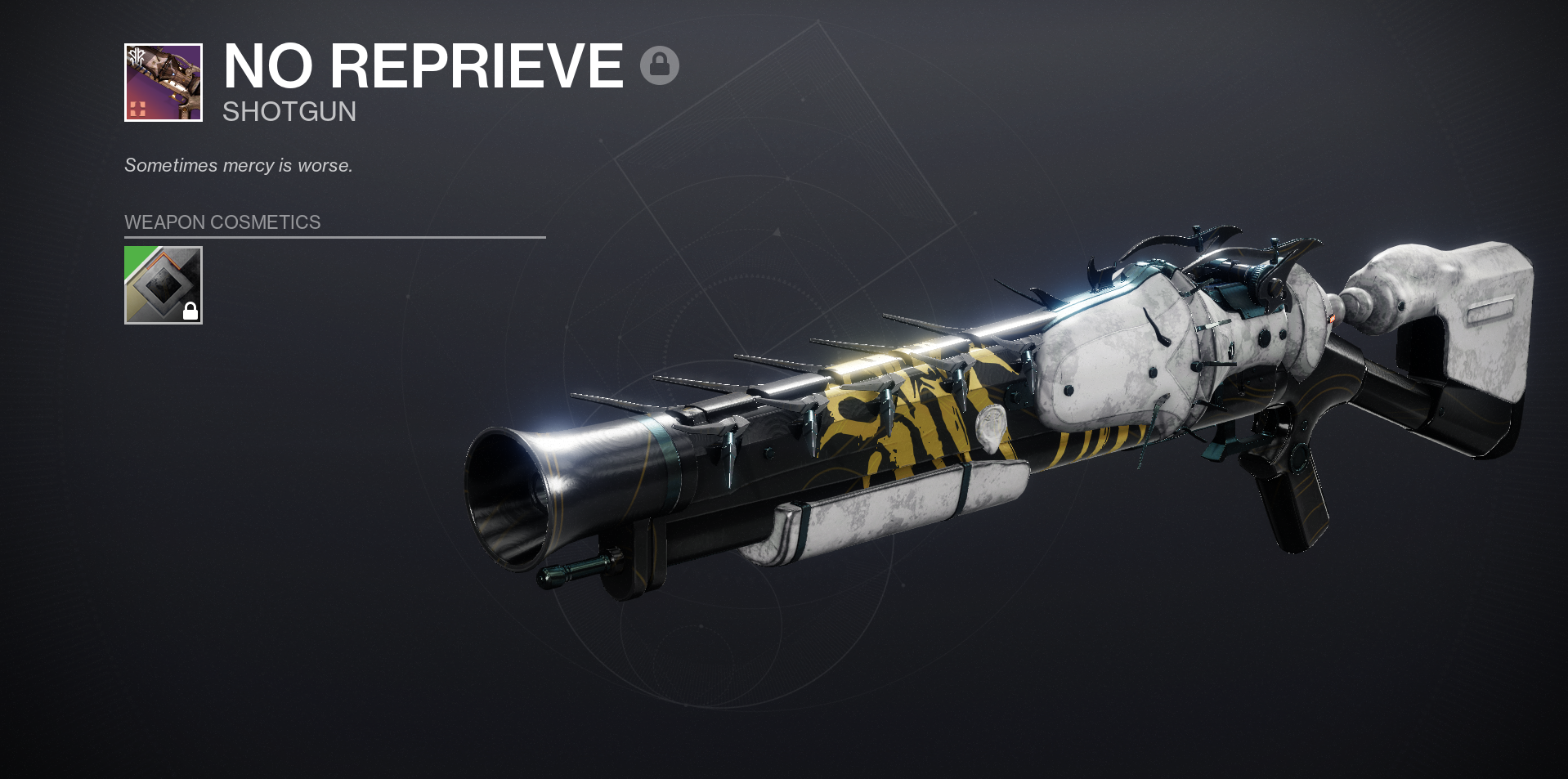 The shader gives the weapon a visual design similar to that of the base Salvation’s Edge raid weapons; a black, gleaming, metallic undercoat with hints of gold and a subtle grey animation.