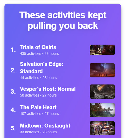The stats you can see in your Destiny 2 Wrapped 2024 recap include your most-played activity type (and how many hours you spent in it), top 10 most-played activities, the highest streak of consecutive days of playing Destiny 2, PvP stats, class stats, and more.