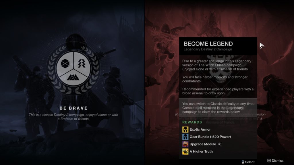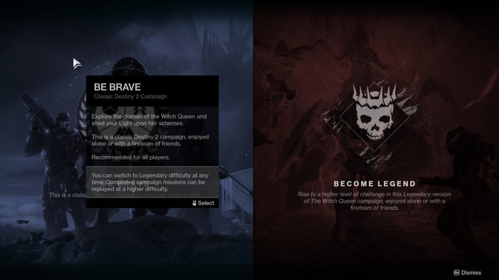Players who load up The Witch Queen for the first time will be treated to a short cinematic after they select a character. But before the next part begins, they must make a choice: Be Brave or Become Legend? Normal or Legendary?