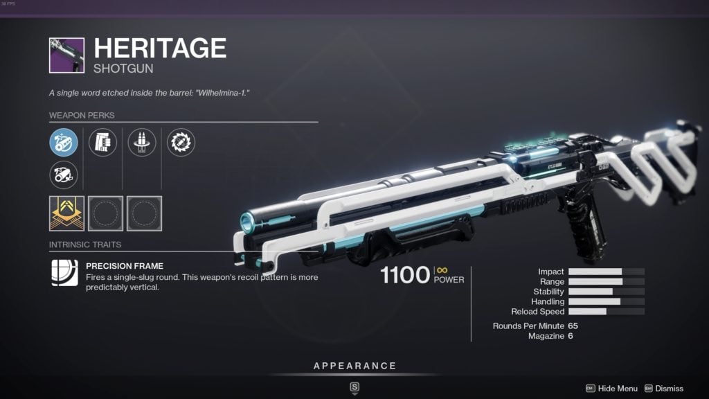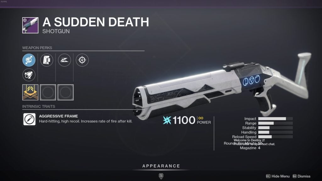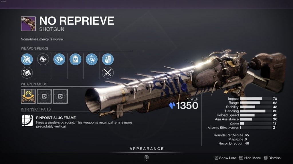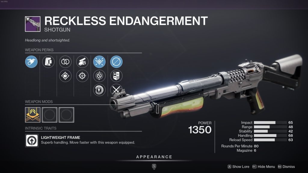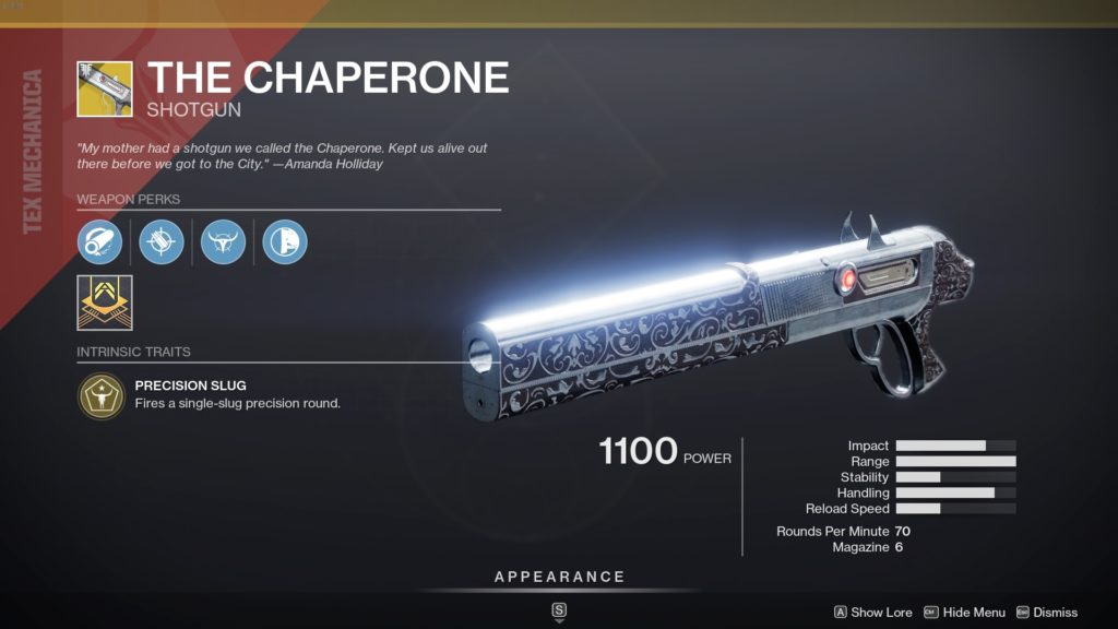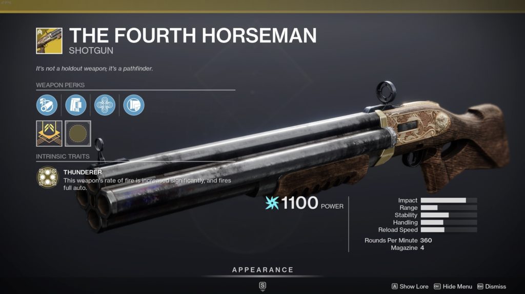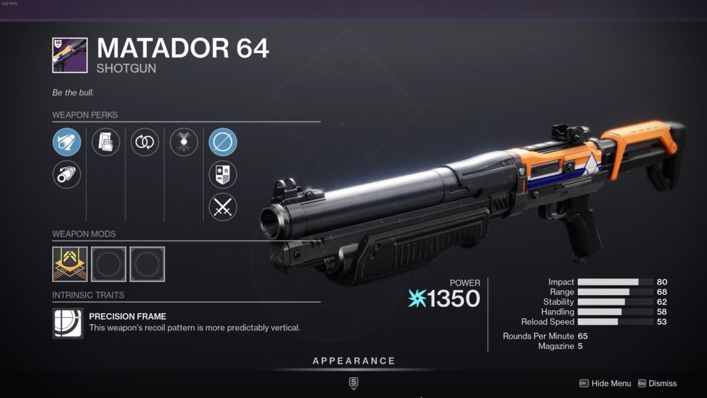 Do you see the range on this thing, in the pic above, in the bottom right? This slug shotgun is capable of one-tapping enemies in Crucible from long range if you hit a headshot. Plus it’s a kinetic weapon, so you can get creative with your loadouts.