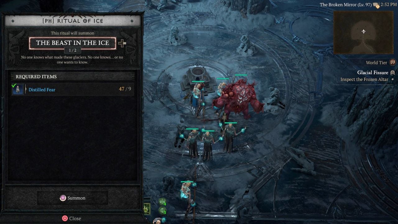 To summon the normal Beast in the Ice (the level 85 one), offer nine Distilled Fear at the altar within the dungeon. You can get this by participating in World Tier Four endgame content like Helltides, World Bosses, or Nightmare Dungeons (Tier 30 or higher).