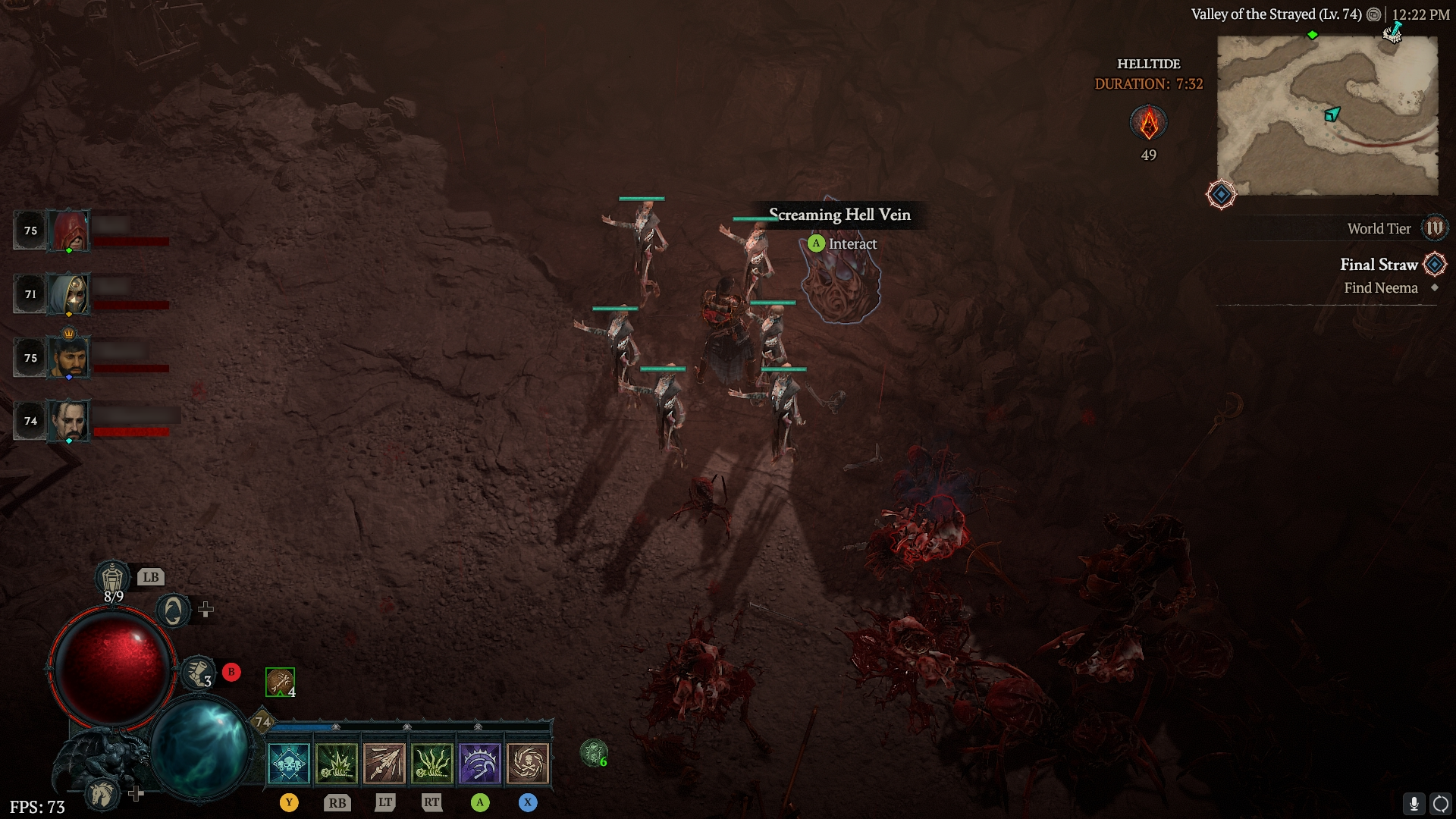 Traveling to the nearest hub through your portal (T or down on your D-Pad) will let you make a quick stop to sell off whatever loot you’ve gotten before returning to the Helltide. If you weren’t close to a node, traveling to the nearest hub will also let you teleport to your party members if they’re close to a Screaming Hell Vein, allowing you to make the most out of your Forgotten Soul farming.