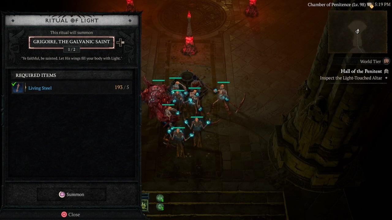 You can summon Grigoire, the Galvanic Saint in Diablo 4, by placing Living Steel inside the Light-Touched altar. The amount of Living Steel you need to use depends on whether you’re summoning normal Grigore or tormented Grigoire.