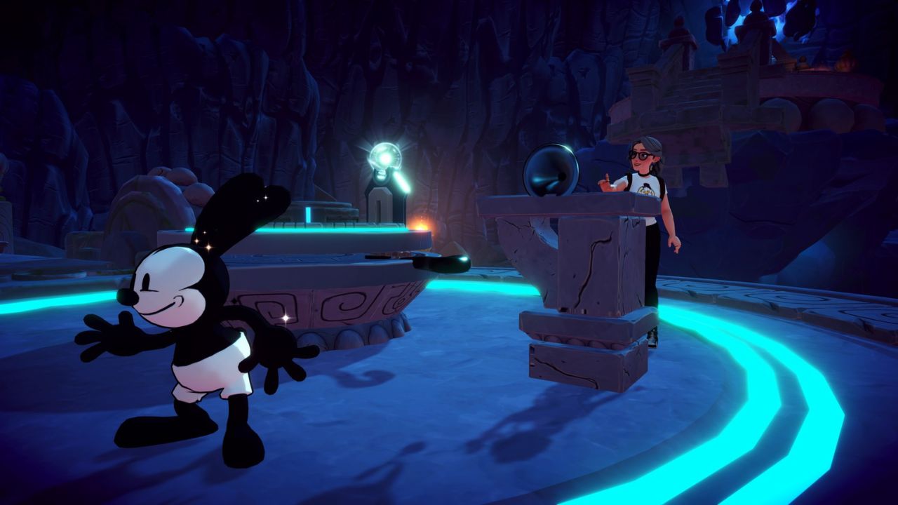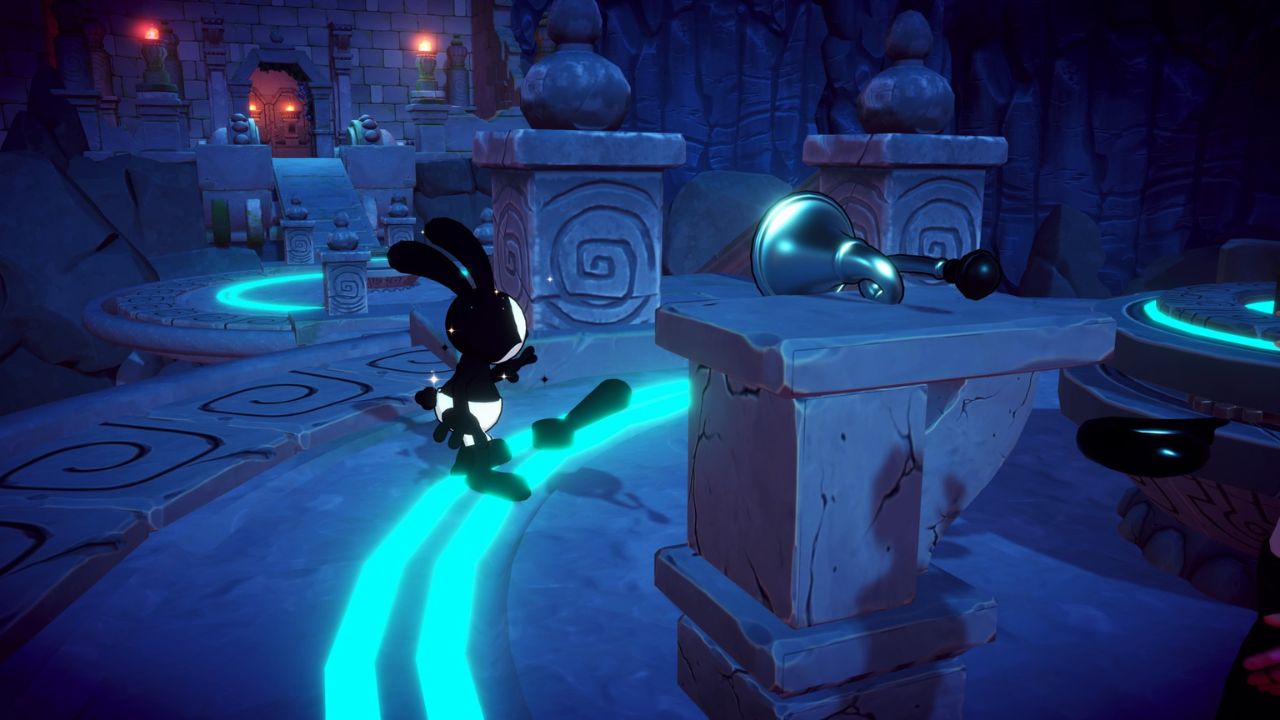 Break the rocks on the left to access the horn. Once you interact with it, it will make a loud sound and startle Oswald, who will drop a physical “exclamation mark.”