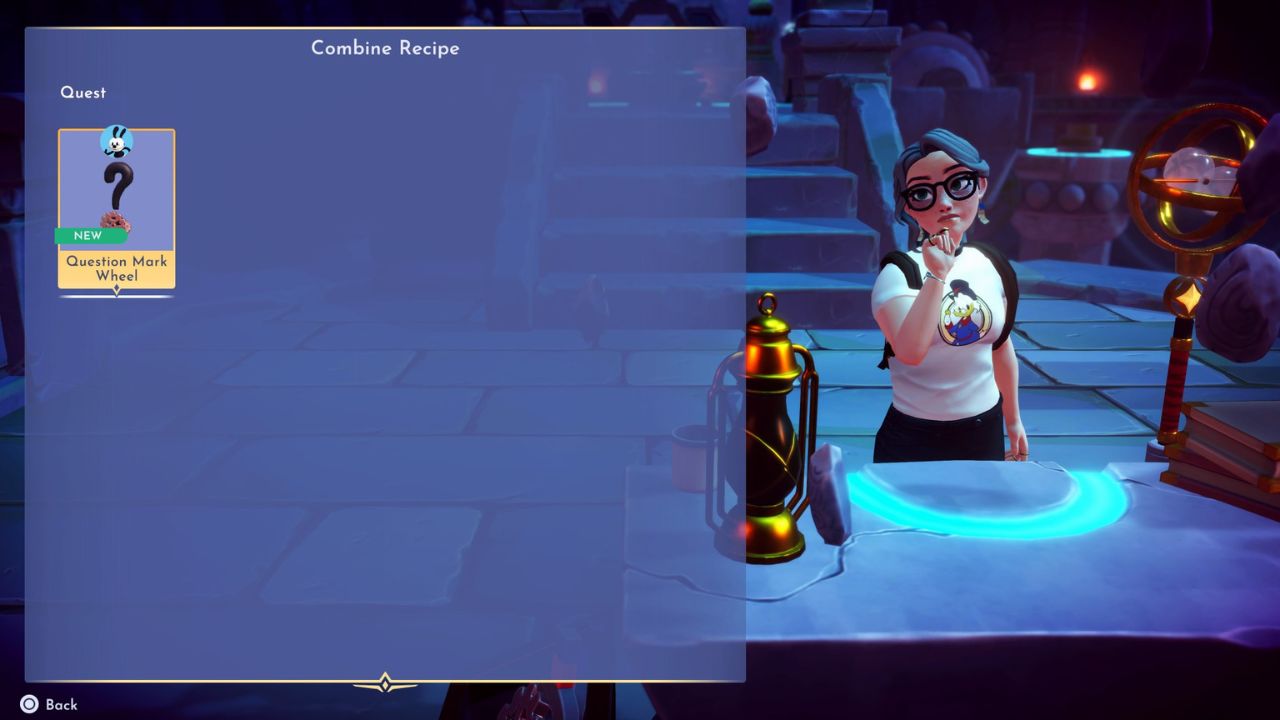 To craft the Question Mark Wheel to rotate the bridge, pick up the physical “question mark” Oswald drops and catch the three white gears. Two are on the platform with you, and one is back on the platform with the bridge lever.