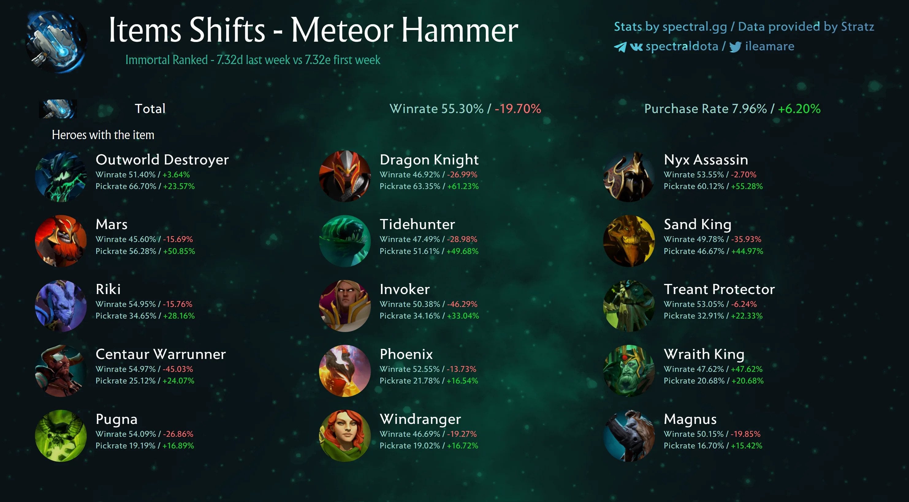Midlane heroes are no exception to Meteor Hammer as well. The classic Outworld Destroyer-Hammer build makes its resurgence along with the Quas-Wex Invoker build that was rarely picked up before this patch. The unconventional Windranger build with a Meteor Hammer has now become popular as well, although that is better played in a support role.