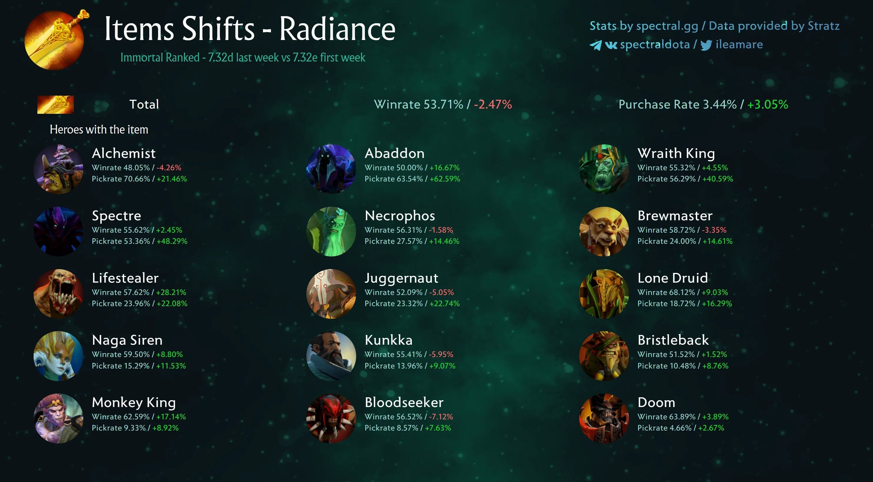 Heroes such as Wraith King and Spectre, who used to build Radiance as their first item are now doing it again. Naga Siren and Lone Druid follow suit, building the item to accelerate their farm and giving them much-needed survivability. This trend extends to the offlane role as well, with heroes such as Necrophos rising from the grave with his Death Pulse buffs as a powerful Radiance carrier.