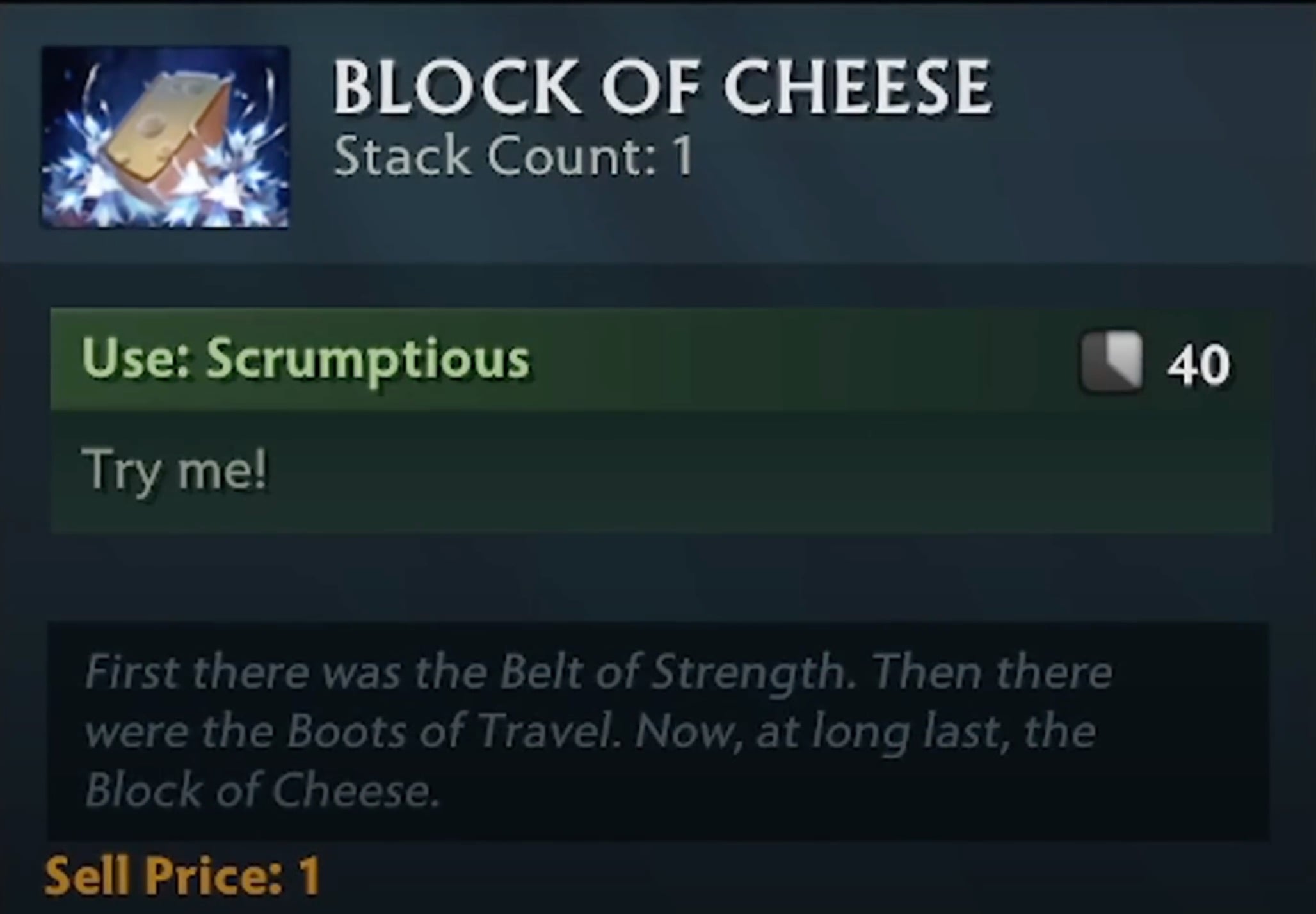 - Pick up the Cheese, and it’ll automatically combine with three Greater Healing Lotuses to form a Block of Cheese in Dota 2.