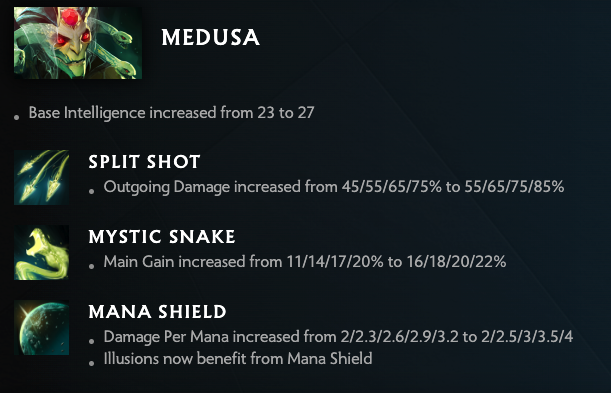 One of the biggest sets of Dota buffs came for Medusa, who got boosted damage for Split Shot, increased gain from Mystic Snake, and a useful update to Mana Shield that now applies it to the hero’s Illusions.