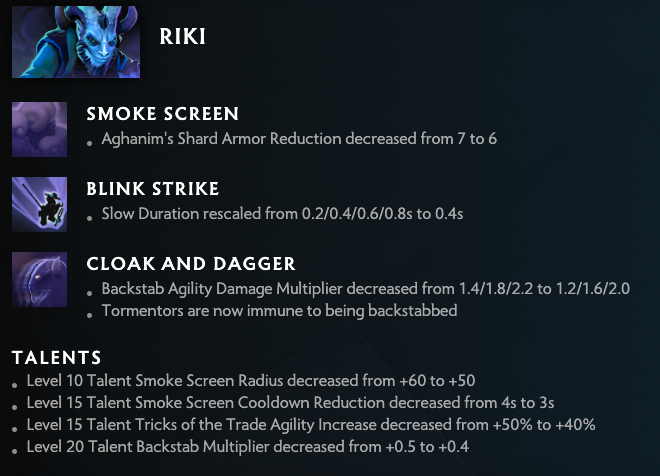 For anyone who was playing pubs, or looking at usage rates over the last week, it will come as no surprise to see Riki, Phantom Lancer, Silencer, and Void Spirit all being hit at least a little. Riki is taking the brunt of the damage with nerfs to Smoke Screen, Blink Strike, and Cloak and Dagger.