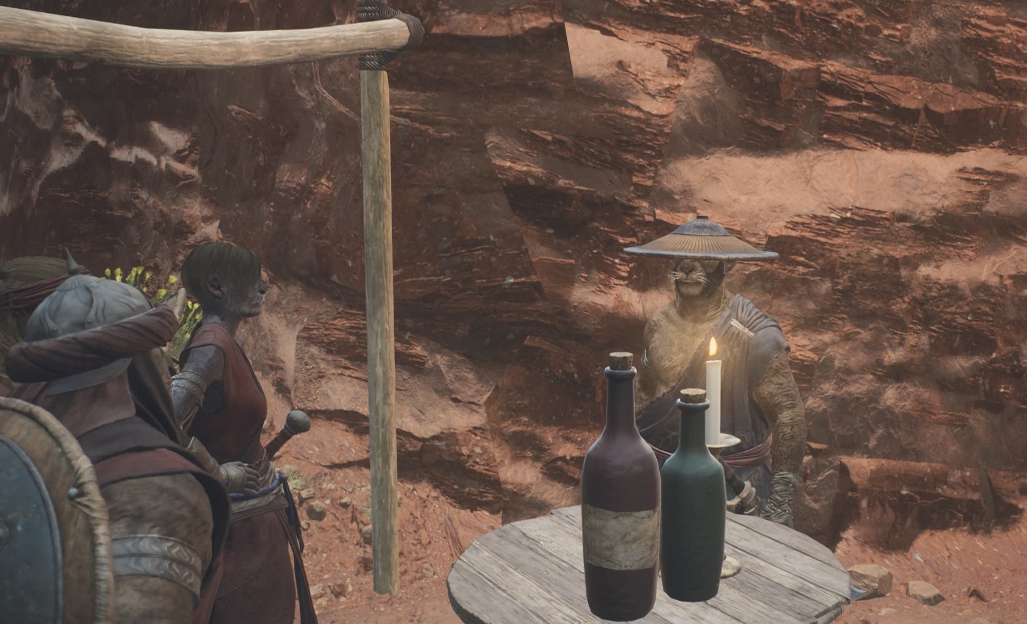 Here, Roger is standing at a table outside the tavern along with a few of their friends. When you cross paths with Roger, they will call you out for having Pawns in Bakbattahl, which is generally frowned upon by the residents. This begins the “Welcome to Bakbattahl” quest in DD2.