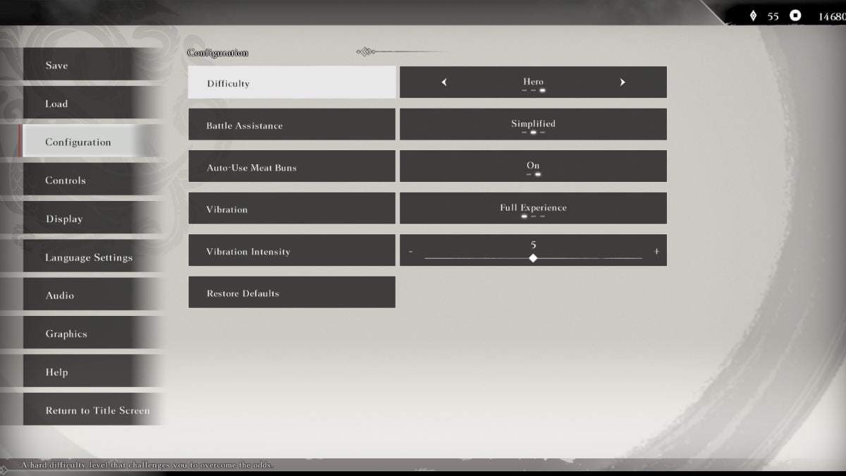 | Hero (Hard) | Enemies are more aggressive, have stronger attacks and skills, and employ coordinated tactics more often. Blocking depletes bravery and the timing for parries and evades is more precise. Battles are decided more quickly, and enemies don’t drop Meat Buns. The Gold and Skill Points earned in battle are increased slightly. |