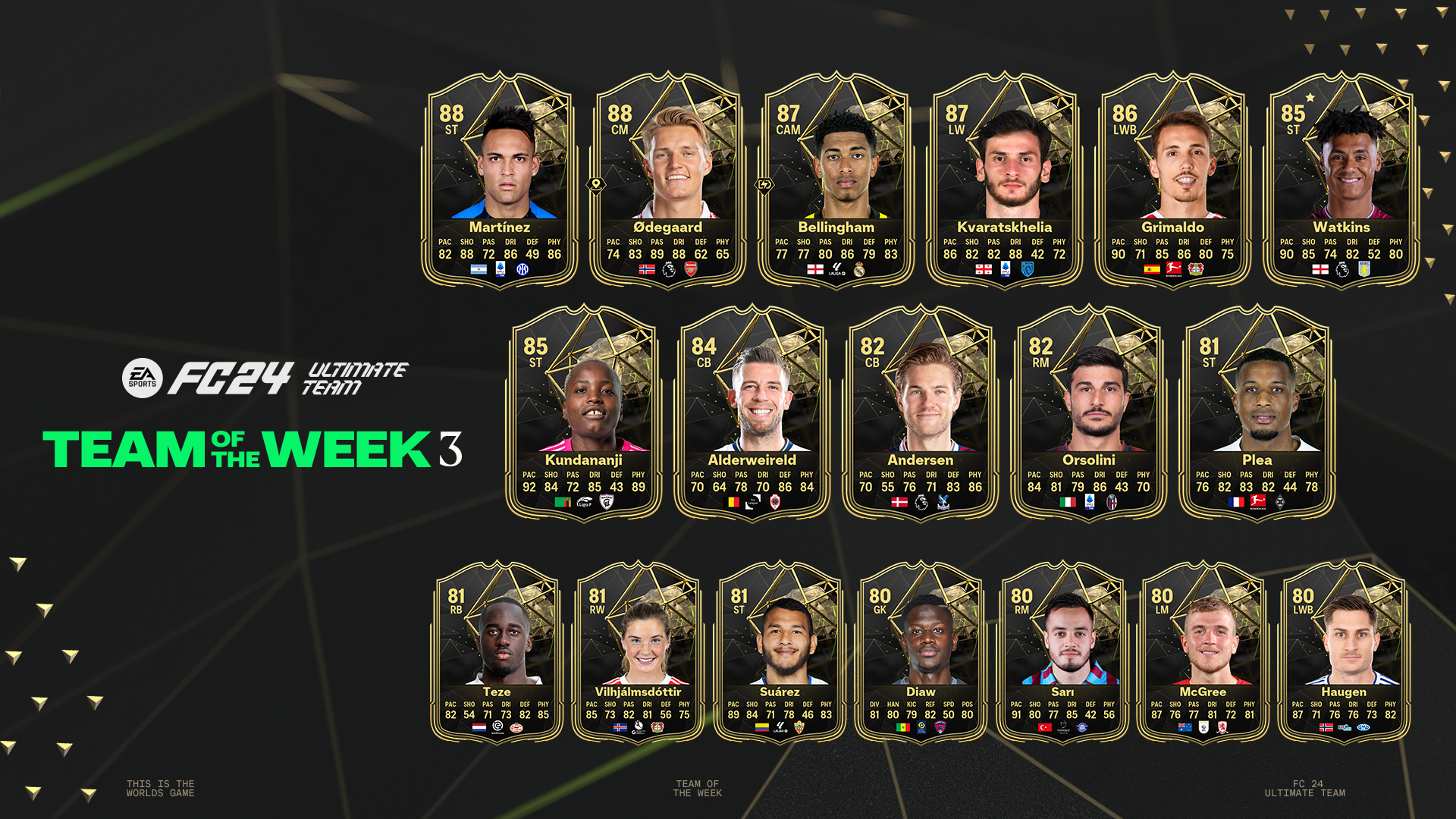 The Team of the Week (TOTW) 3 arrived in EA FC 24‘s Ultimate Team on Oct. 4, adding upgraded versions of the Inter striker Lautaro Martínez, Real Madrid midfielder Jude Bellingham, and Arsenal playmaker Martin Ødegaard, most notably.