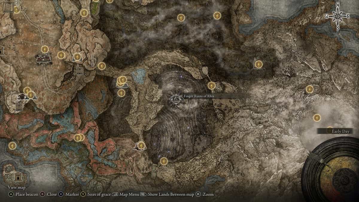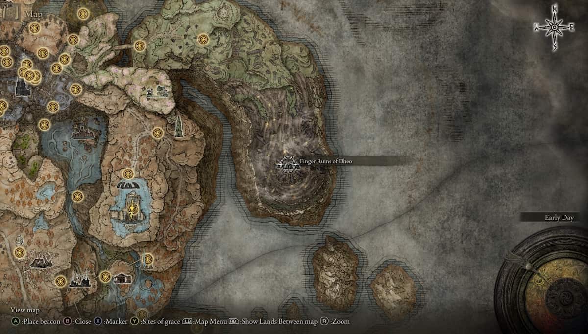 Once finished, return to Ymir and speak with him to receive another item, Beloved Stardust. You must then take it to the Finger Ruins of Dheo, pictured below in the middle of the peninsula east of Scaduview, and do the same while fighting or avoiding all the creepy enemies in the area.