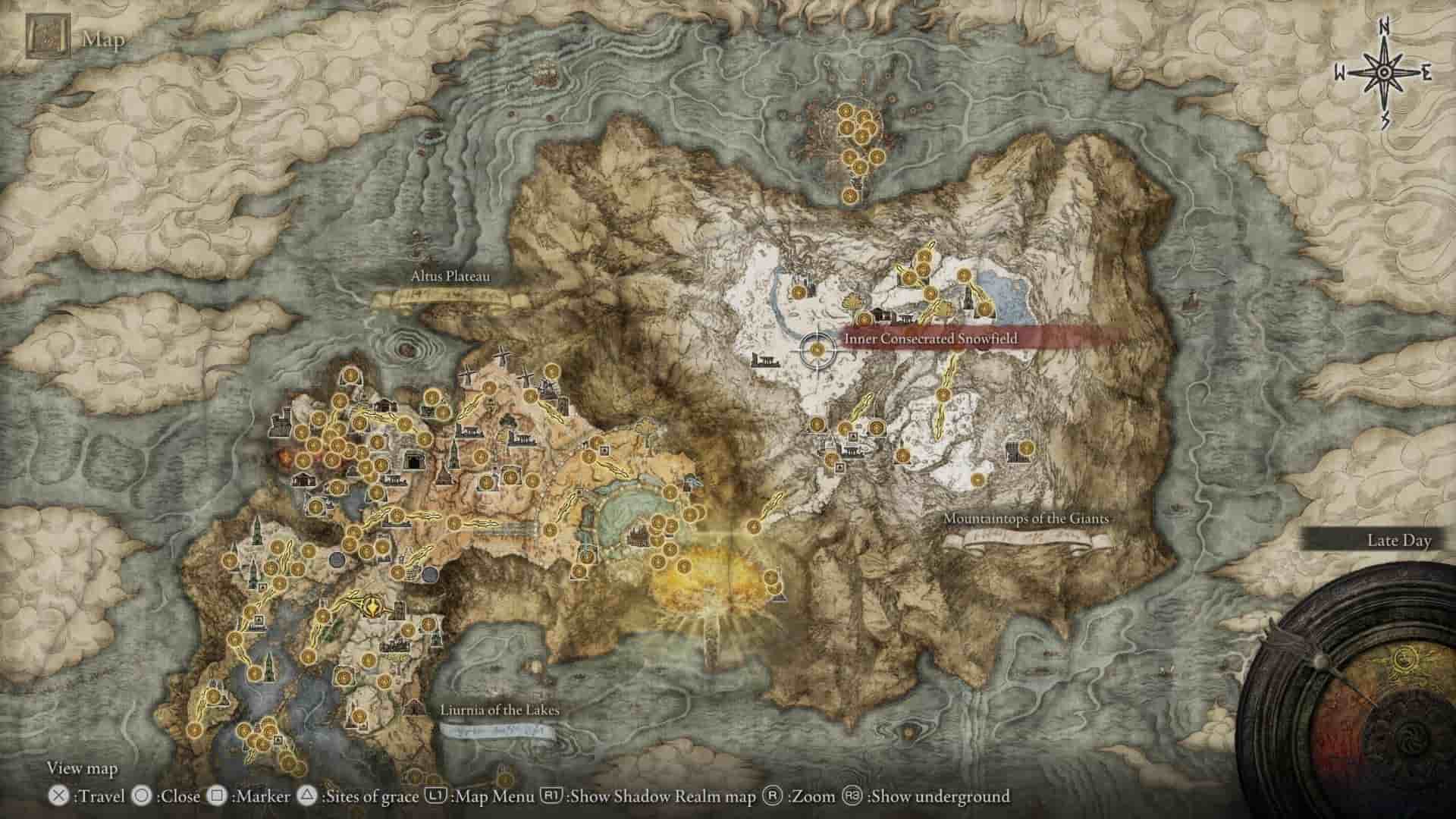 The Consecrated Snowfield is an optional location in Elden Ring’s endgame. To get there, collect both halves of the Haligtree Medallion, then use the alternate interact option at the Grand Lift of Rold. Once there, head toward the Inner Consecrated Snowfield, as marked in the first picture above, then set a custom waypoint to the spot highlighted in picture two. This is the portal’s location. Mount your steed, ride to your destination, and head into the portal.