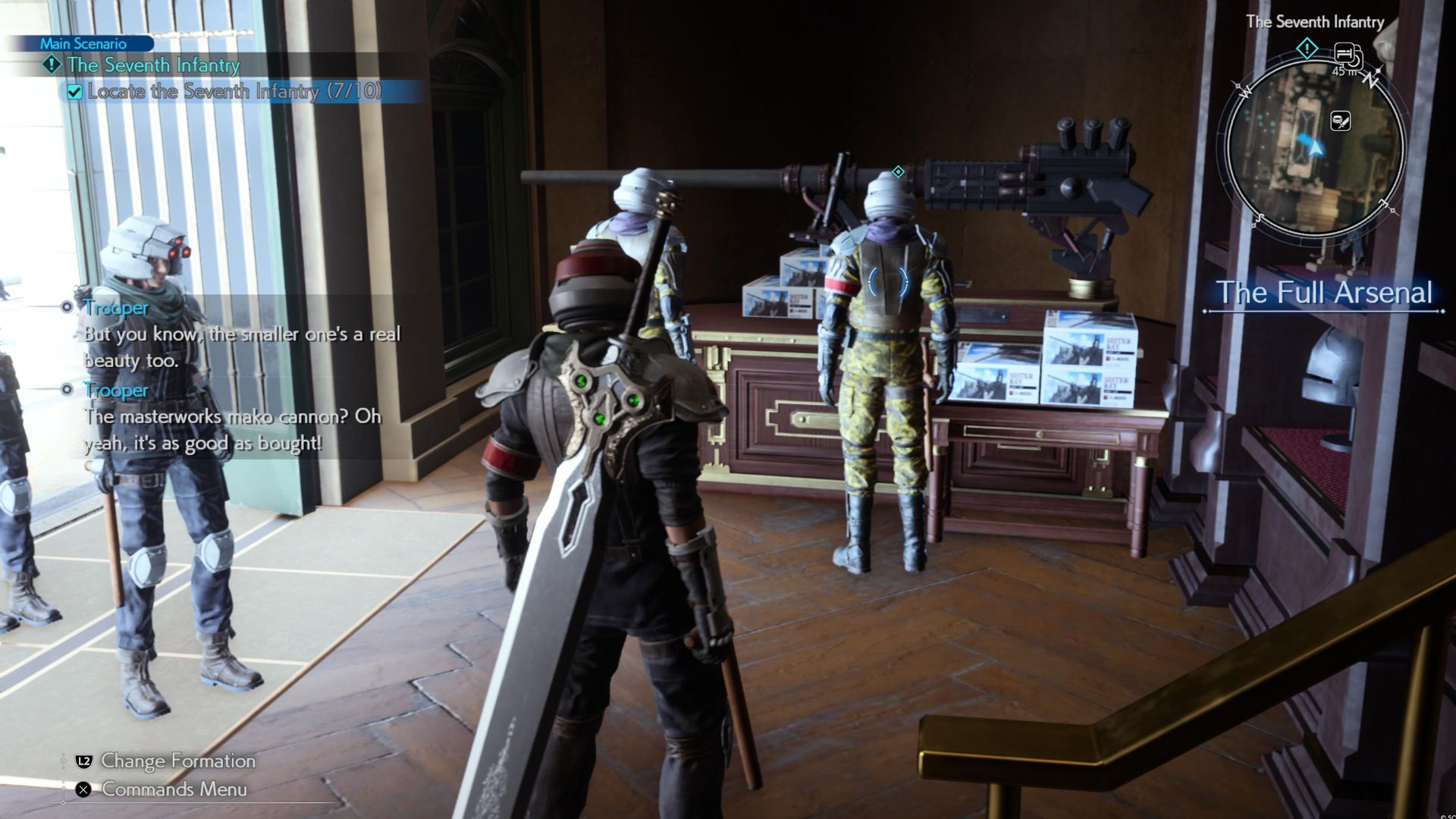 Consult with the map to find The Full Arsenal next to Cecilia’s of Junon, and the unit will be at the front of the store, next to a door leading to the main street, checking out a scaled-down version of the Junon cannon.