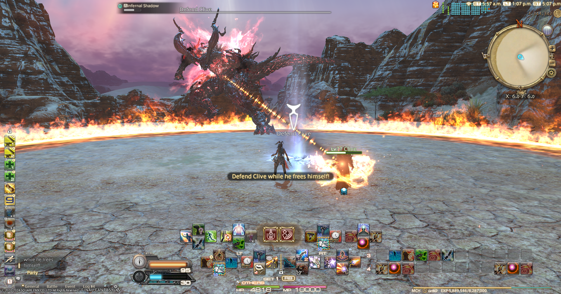 The second phase begins with the boss casting Fetters on Clive and immobilizing him. Shortly after, you’ll see a shining marker with a prompt to “Defend Clive.” If you’ve played through Stormblood, you’ll recognize this mechanic from the fight against Susano—the key difference is that you have to click the prompt instead of just walking into it.