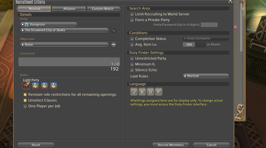 - If you want to open your own Party Finder, it’s advised to check “Remove role restrictions for all remaining openings” and “Unselect Classes” to allow Blue Mages or helpers from other jobs to enter the duty.