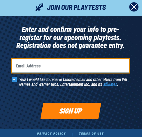 In the upper right corner of the homepage, there’s an orange button with the text “Sign up for playtests.” Clicking that button will generate a pop-out asking you to submit an email address to pre-register.