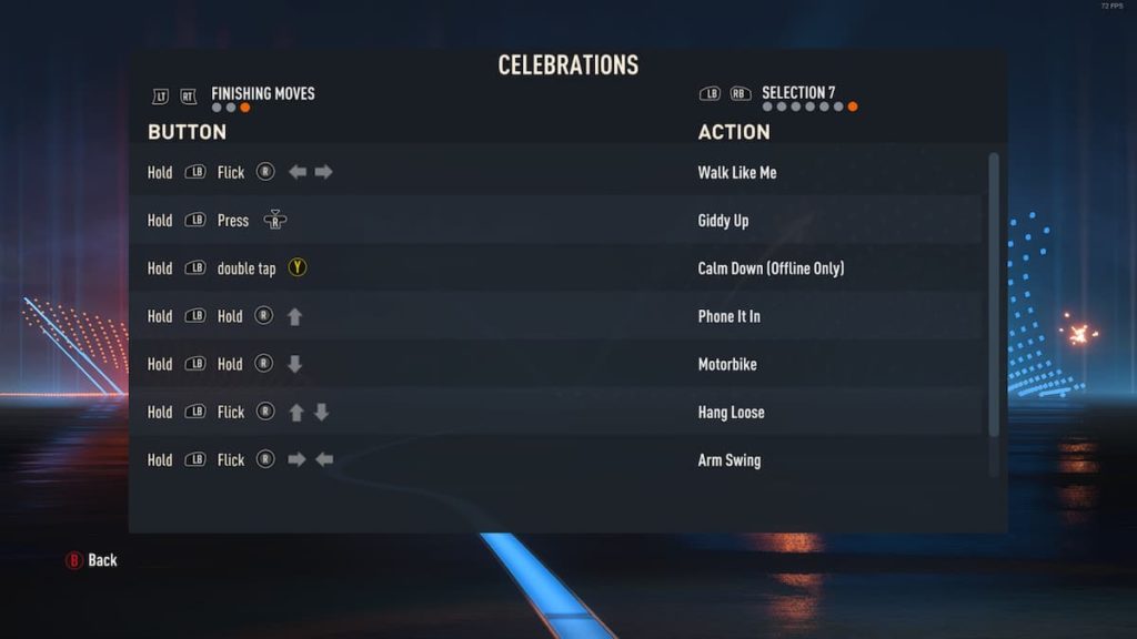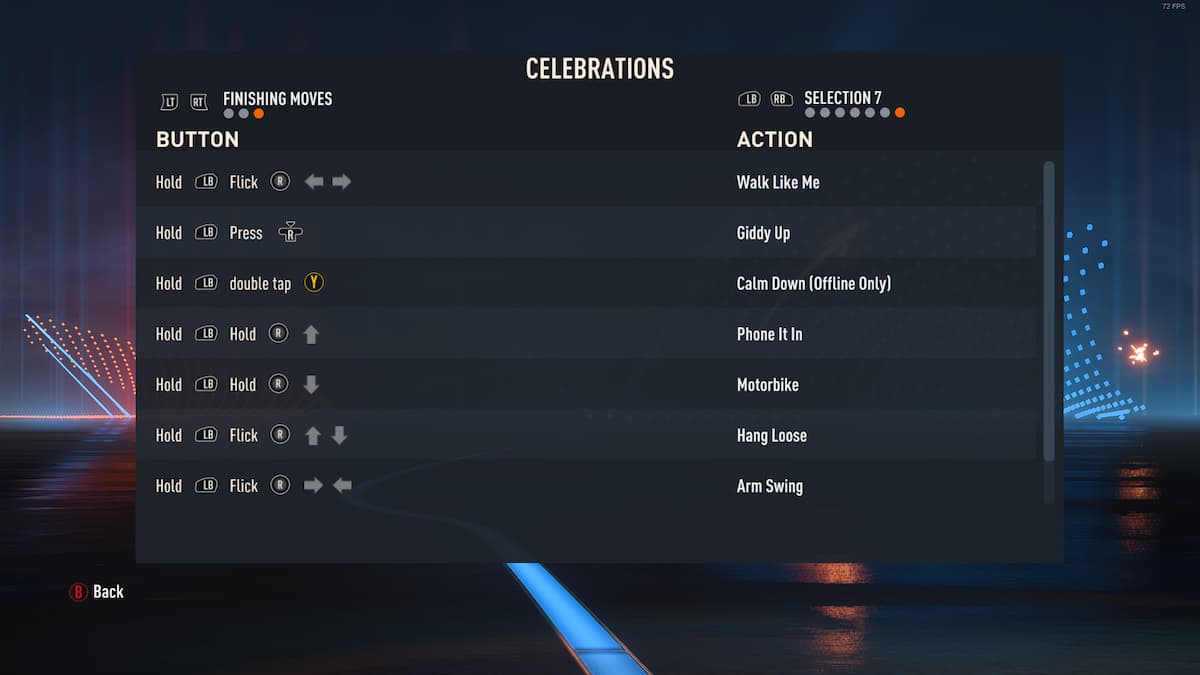 The Griddy is a simple celebration and doesn’t require players to memorize too many button functions. After scoring a goal against the opponents, your player will run towards the corner flag to celebrate. Hold down the RT/R2 button, and flick the Right Stick in the Up direction twice. Popularized by Justin Jefferson in the NFL, this viral dance move is named after its creator Allen Davis.