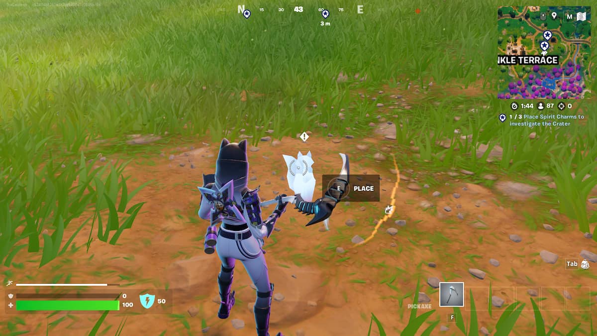 To start investigating the Crater, take the bridge to your north from Kendo and go straight until you come across a fox-shaped spirit charm. Interact with the charm and place it. Now, go to your left and find the charm on a small hill, and then finally find the last Spirit Charm next to the giant Crater to finish this part of the challenge.