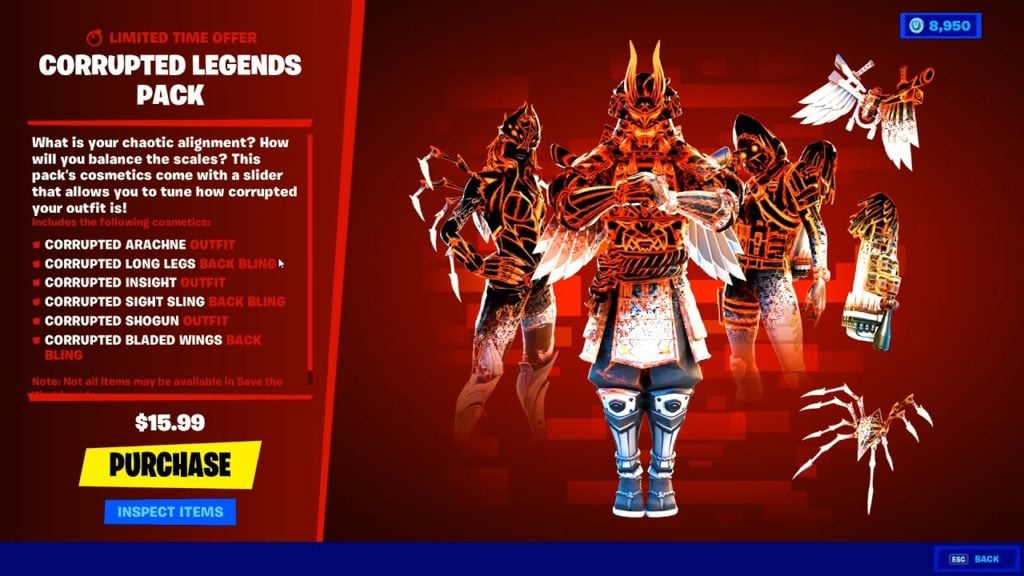 Boasting the unique feature to set the corruption level of each skin, this bundle includes variants for Archane, Insight, and Shogun. These three skins come with simple white and black decal, but the more corruption is set, the more black and red begin to show. Along with these come matching back blings, boasting the same ability to change appearance with corruption. This is one of the most unique bundles in the game today.