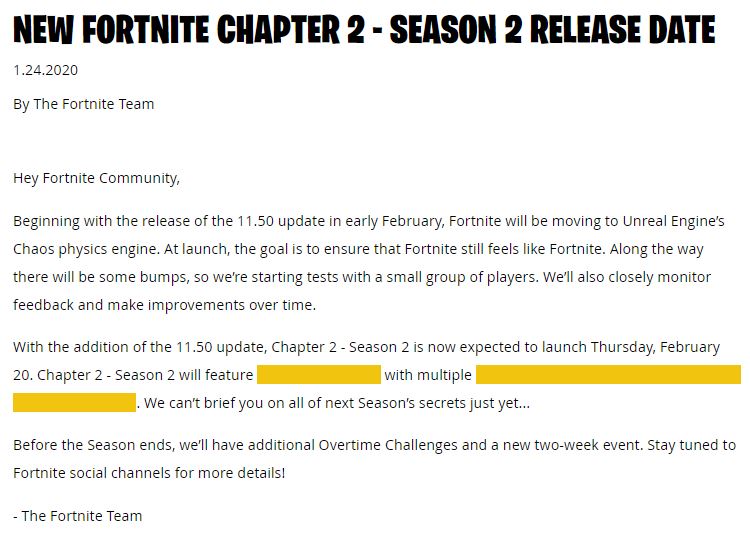 Epic Games confirmed today that the next season of Fortnite will be delayed to Thursday, Feb. 20.