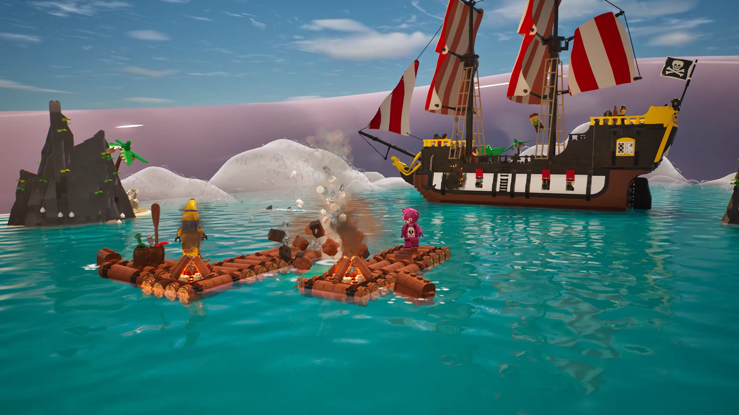 On this island, players will try to stay afloat on LEGO-built rafts while navigating in treacherous waters infested by pirates. Themed around classic LEGO Pirates scenarios, this play experience also introduces the infamous character Blackbeard, who will attack the players with cannonball attacks from his Barracuda Ship. Players will have to collect resources, including wood and treasures, to reinforce existing rafts or construct new ones in case they’re hit by a cannonball.