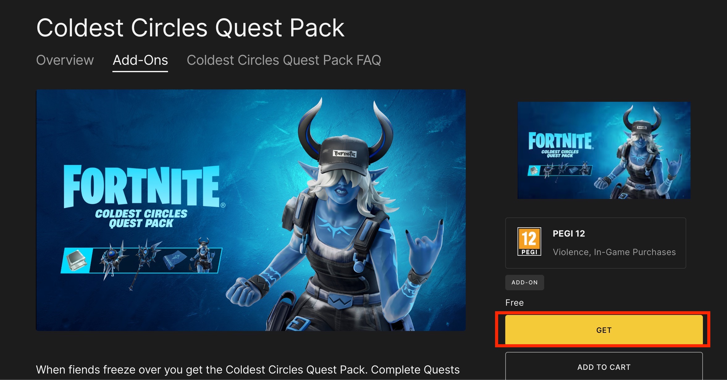 - Visit the store page for the Coldest Circles Quest Pack and click on Get to add the cosmetic pack to your account.