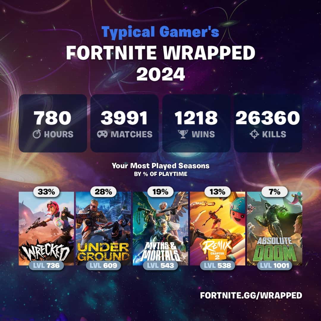 Fortnite Wrapped 2024 primarily focuses on all the seasons of Chapter Five starting from season one, which was themed Underground, to the latest small Chapter Two Remix season, which ended with an explosive live event. The ongoing season one of Chapter Six will be counted in next year’s Wrapped.