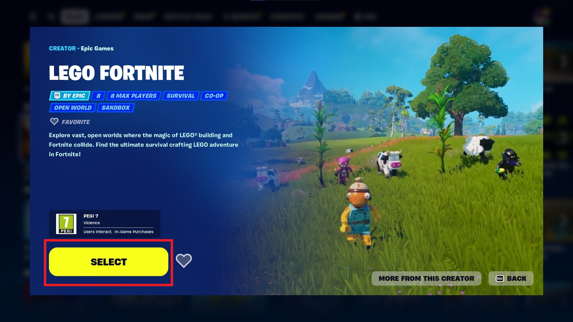 - Choose LEGO Fortnite under the “By Epic” category in the Discover screen and click on Select.