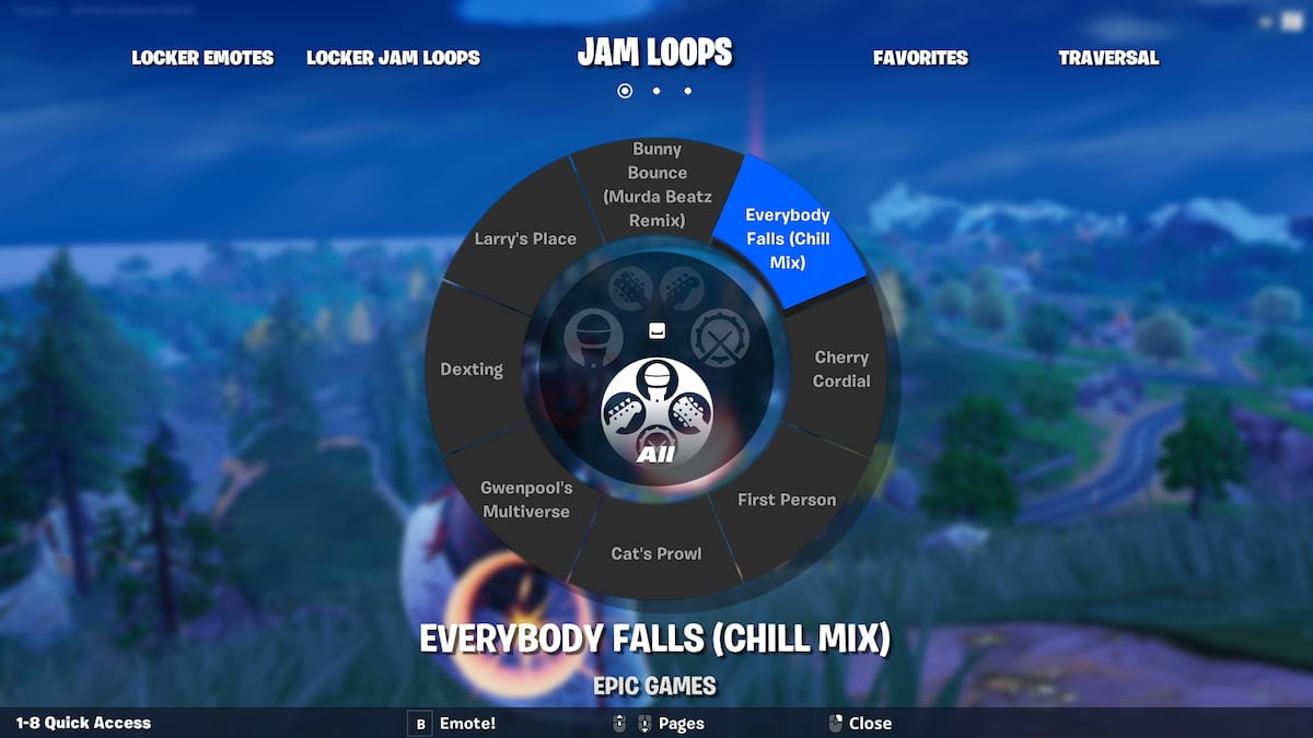 To finish the Jam alone, using “All” instruments at once challenge in Fortnite, you have to press B to bring up your emote wheel and go to Jam Loops. By default, it’s over your emotes, so you need to choose the Jam Loops option at the top of your screen to bring up different songs on your screen. Now, you can choose any one of them and perform it in an open space.