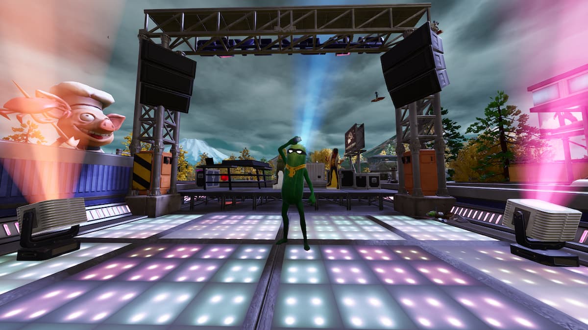 To start the Somebody’s Planning a Party in Crime City quest in Fortnite, meet the Big Dill NPC, who always spawns at the terrace with a dance floor. It’s very easy to spot this building because of the shining lights that point toward the sky. You can land here directly from the battle bus to interact with the NPC.