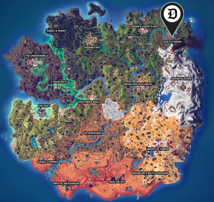 To fly over Doom’s Castle in Fortnite, you will need to get your hands on Iron Man’s Flight Kit by opening the Stark Industry Chests spread all over the landing pads on the island. We’d recommend you visit the landing pad which is located on the southern side of Doom’s Courtyard, closest to the Doom’s Castle point of interest in the east.