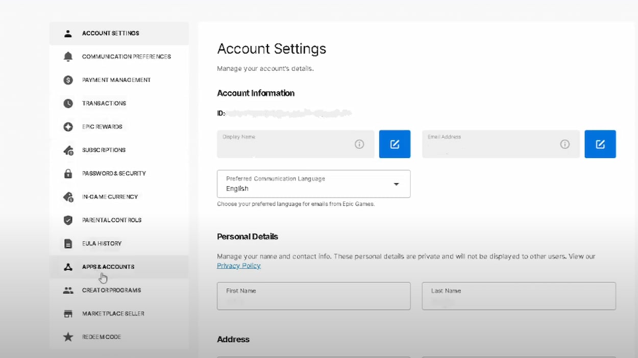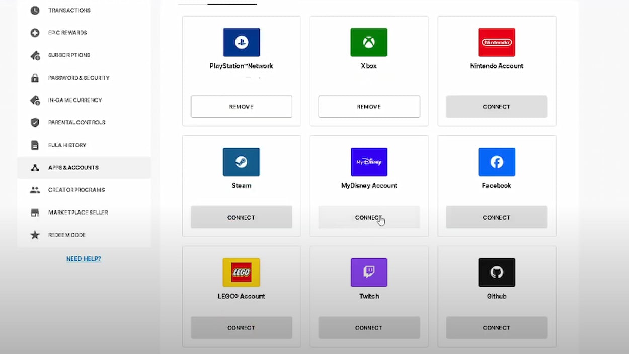 - On the left panel of the Account screen, click the Apps and Accounts button. On the next page, click the Accounts button. Doing this will then show you a list of all the types of brand and gaming accounts you can link to your Epic Games account.