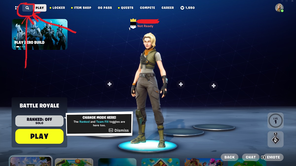 - First, launch Fortnite and enter Creative mode. On PC, you can access the mode by clicking the small magnifying glass icon in the top left corner of the main menu. On consoles, there’s a dedicated button at the side to enter Creative Mode.