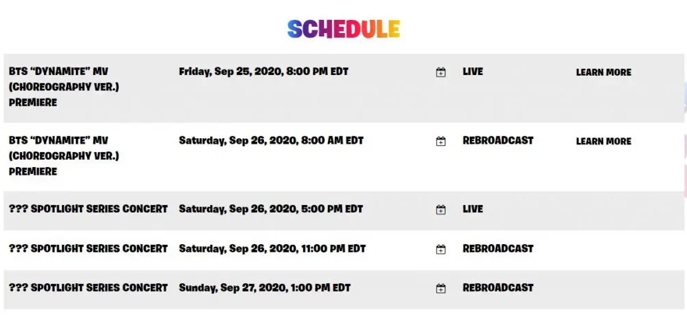 You can watch the premiere of the new video live inside of Fortnite on Sept. 25 at 7pm CT. The full schedule for the event, including rebroadcasts, can be found below.
