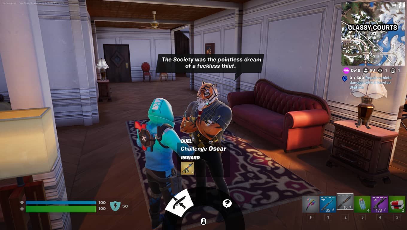 You won’t get his weapon if you eliminate him directly without challenging him to a duel. Thus, always talk to him first and shoot at him after the challenge begins. Even though Classy Courts isn’t a popular hot drop, the gunfire might invite unwanted attention from nearby players, and they might interrupt your fight to catch you by surprise. To prevent this, make sure to loot the mansion thoroughly and get ready for a potential altercation.