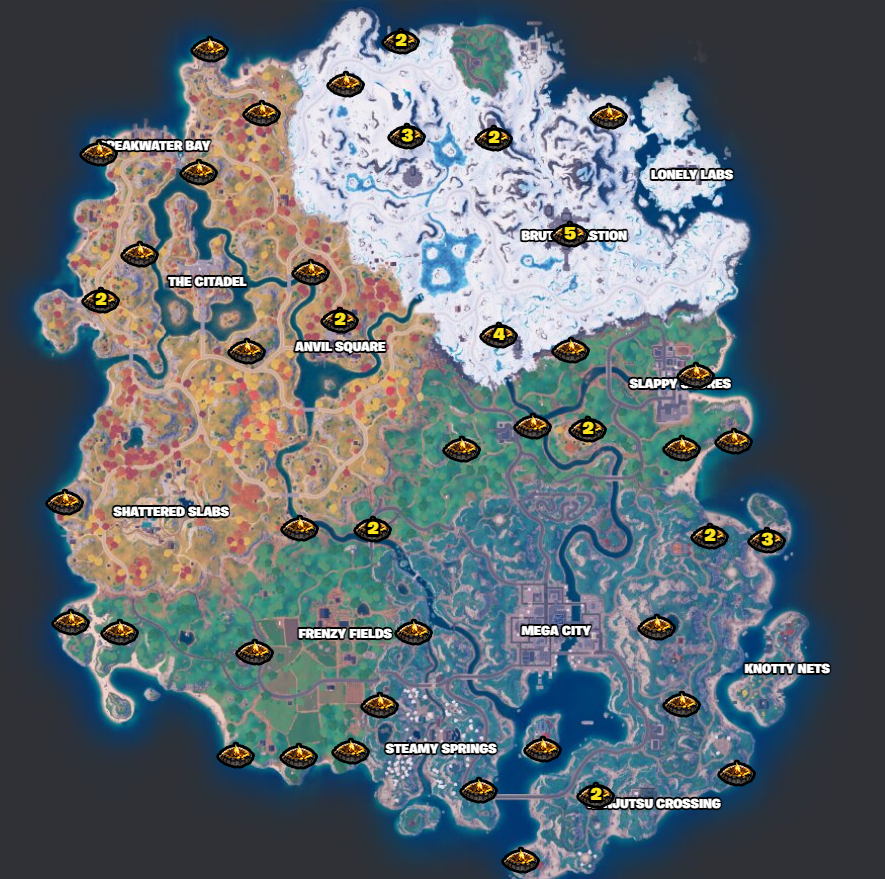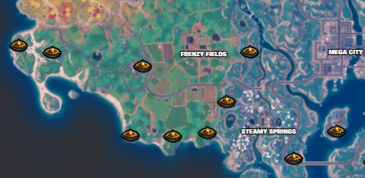 In case you want to know where all the campfires in Fortnite Chapter Four, season two are located, you can check out the entire map below. The number over the campfire icon—like two, three, or five— indicates how many campfires are next to one another in that region.