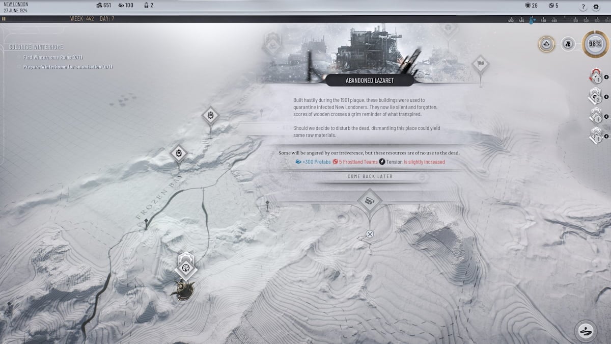 As you explore Frostland, you may come across forgotten landmarks that can yield Prefabs. Those usually have around 300 to 400 Prefabs (like a regular deposit) and require Frostland Teams to move it back to the city.