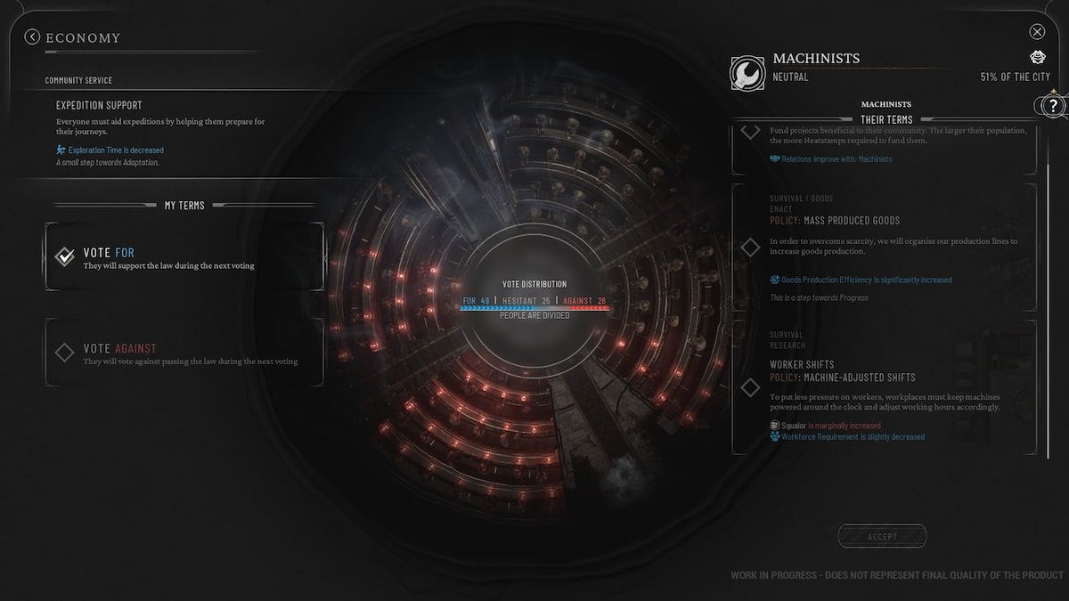 The final way to increase Trust, which is exclusive to factions (subcommunities like the Technocrats), is promotion. Promoting a faction grants it more seats at the Council, which can sway the Law voting towards one side, potentially upsetting the opposition.