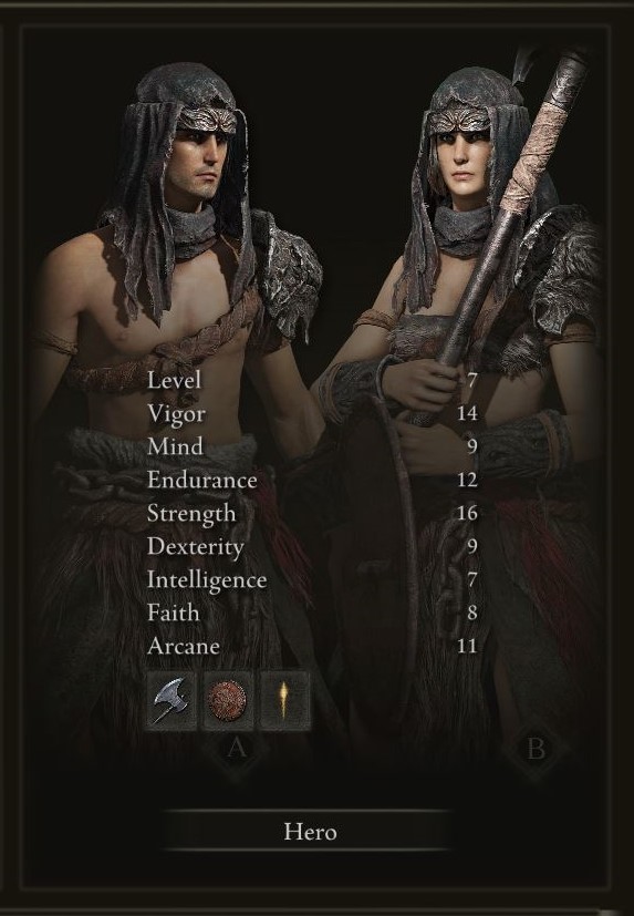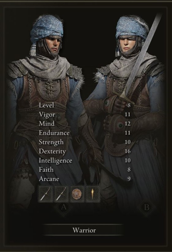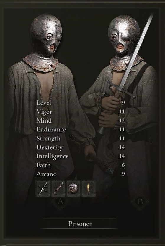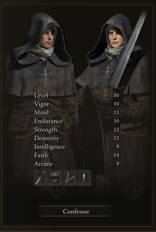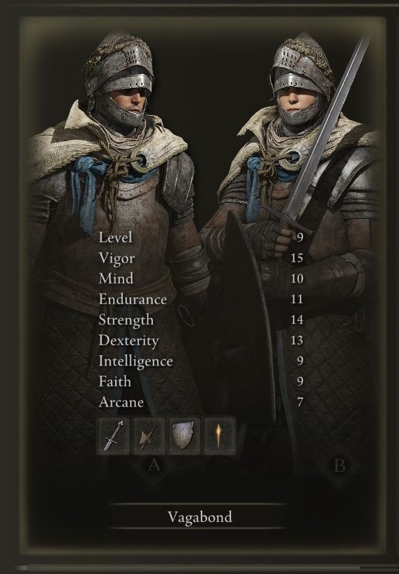 | Class | Level | Vigor | Mind | Endurance | Strength | Dexterity | Intelligence | Faith | Arcane |